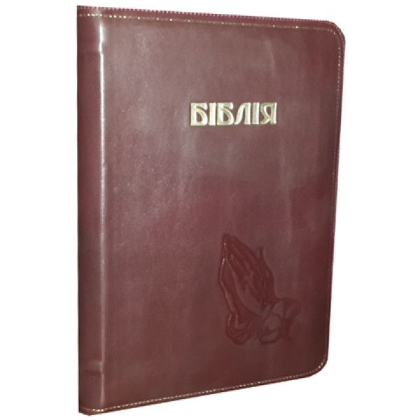 Каноническая Библия на украинском языке. Перевод профессора Ивана Огиенко, дословно переведенный с древнееврейского и греческого языков на украинский. Текст расположен в две колонки. Параллельные места по середине страницы. Мягкий переплет из натуральной кожи. Цвет обложки: бордовый. Бронзовый обрез страниц. Без индексов для поиска библейских книг, на молнии. Размер 17 х 24 см.