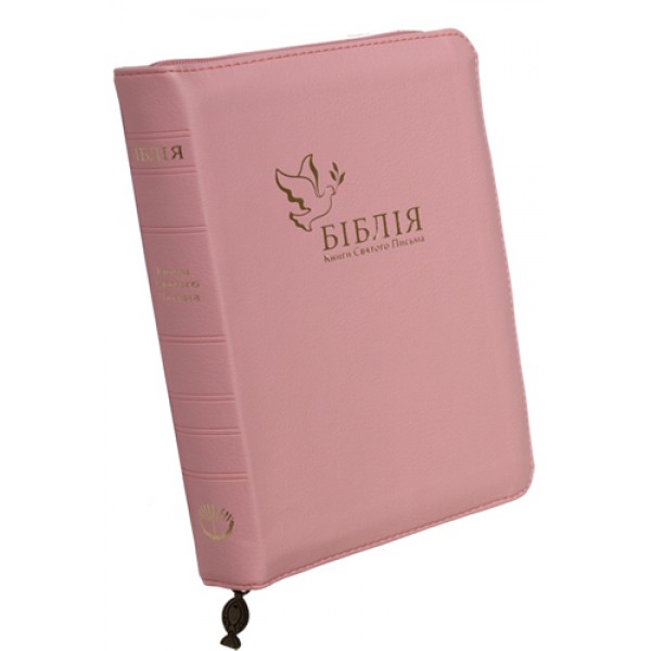 Каноническая Библия на украинском языке. Перевод профессора Ивана Огиенко, дословно переведенный с древнееврейского и греческого языков на украинский. Текст расположен в две колонки. Параллельные места по середине страницы. Мягкий переплет из искусственной кожи, на молнии. Без индексов для поиска библейских книг. Цвет обложки: розовый. Золотой обрез страниц. Размер 130х185 мм