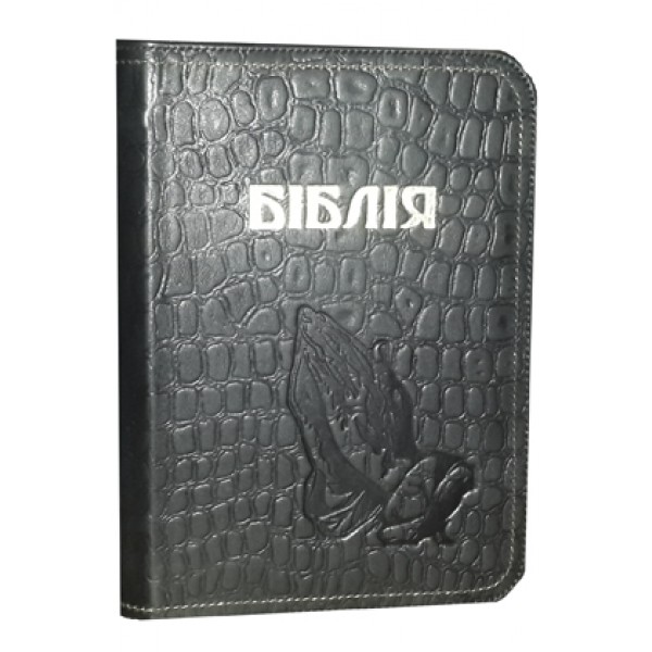Каноническая Библия на украинском языке. Перевод профессора Ивана Огиенко, дословно переведенный с древнееврейского и греческого языков на украинский. Текст расположен в две колонки. Параллельные места по середине страницы. Мягкий переплет из натуральной кожи. Цвет обложки: черный. Золотой обрез страниц. Индексы для поиска библейских книг, на молнии. Размер 13 х 18 см.